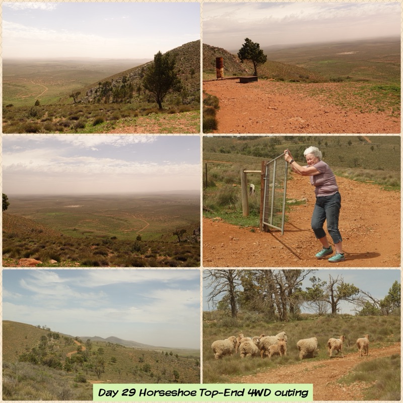 The drive took us basically around the rim of the horseshoe pound with views into the pound & outside at a couple of lookouts. It was a very rocky track & worse than we anticipated but the views were worth it. The worst of it though was that it was EXTREMELY windy & dust in the air. Check Faye’s photo below…